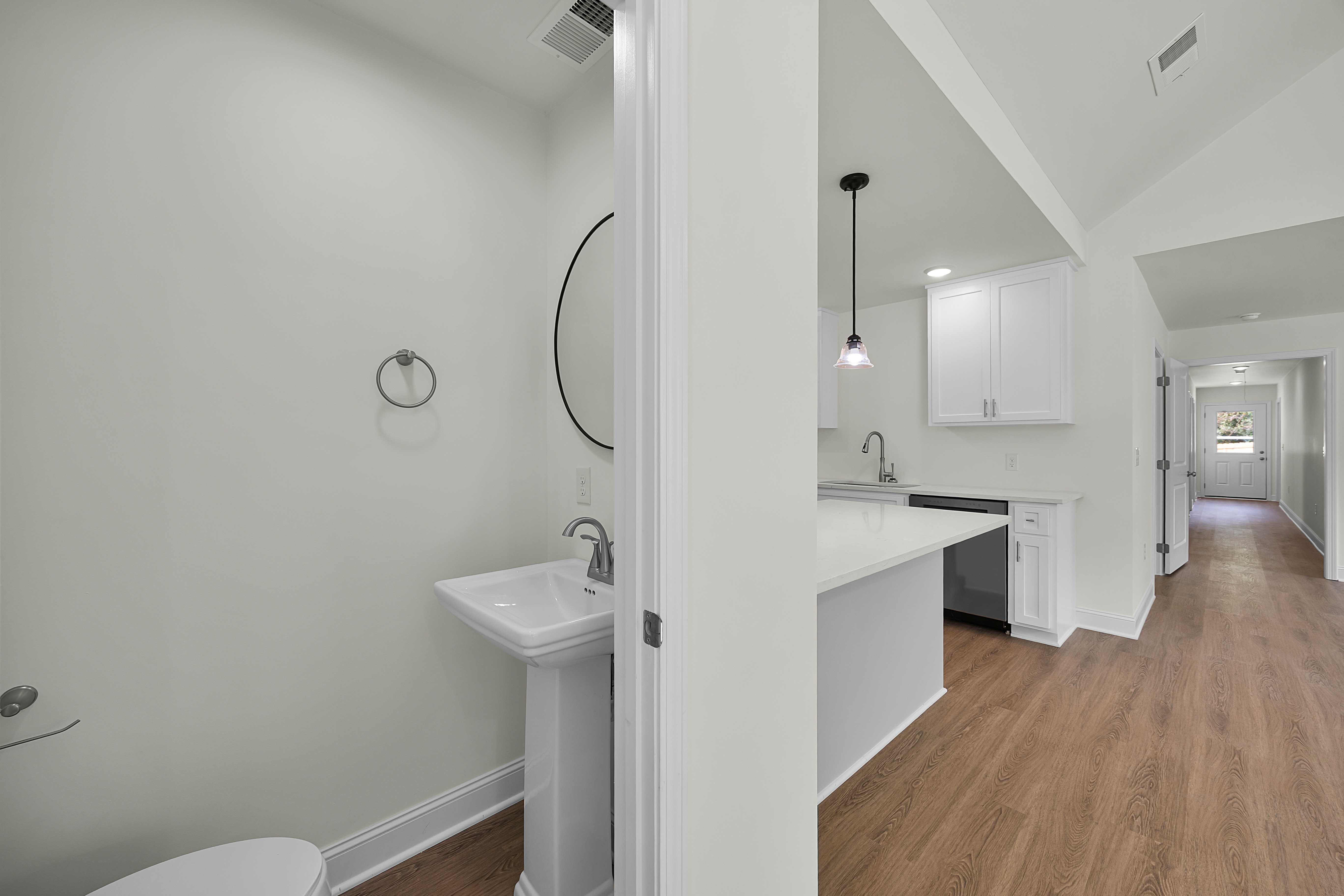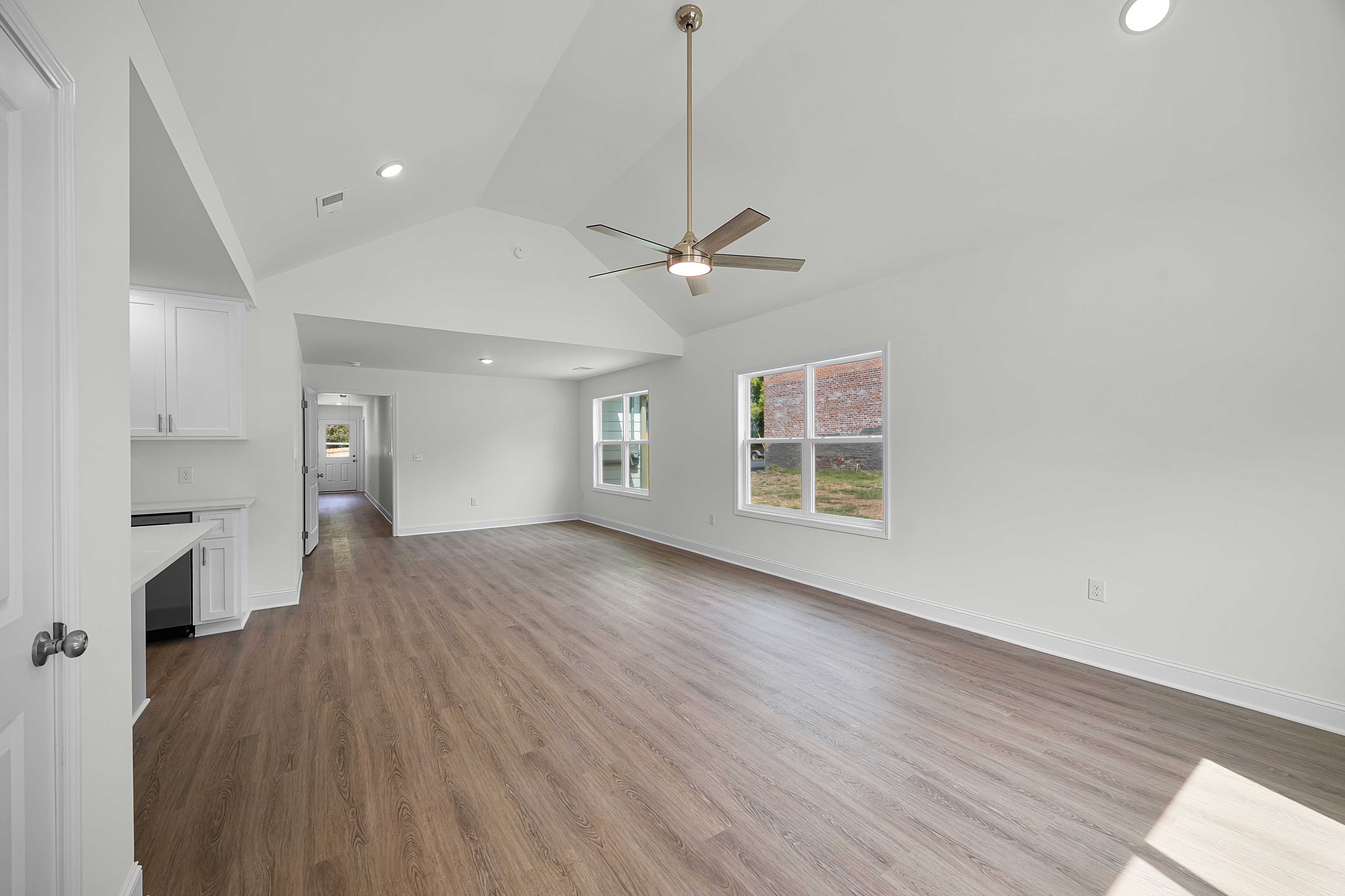 Step inside to an open-concept living space filled with natural light, luxury vinyl plank flooring, and elegant finishes. The sleek kitchen features white cabinetry, quartz countertops, and stainless-steel appliances—all included for your convenience.